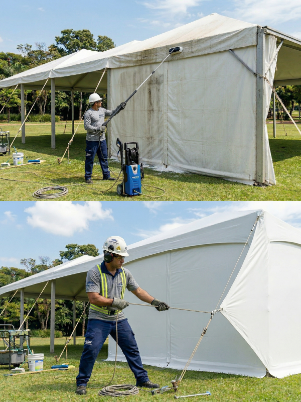 Remoção profunda de sujidades e mofo em lonas tensionadas. Utilizamos produtos de alta performance que não agridem a trama, protegendo o material e devolvendo o aspecto original à sua cobertura
